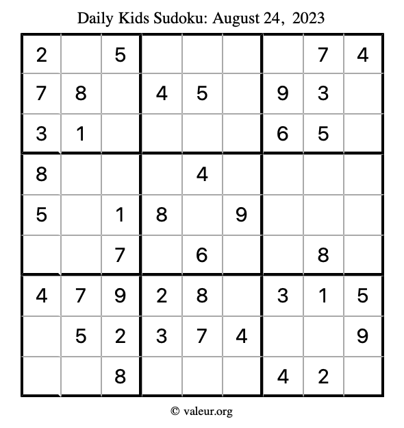 Here is the August 24, 2023 kids sudoku puzzle. You are welcome to print a copy to solve by hand. For your convenience, we have also included the solution further down the page so you can check your work.