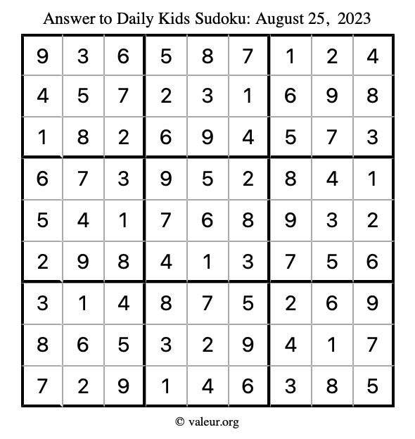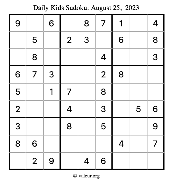 Here is the August 25, 2023 kids sudoku puzzle. You are welcome to print a copy to solve by hand. For your convenience, we have also included the solution further down the page so you can check your work.