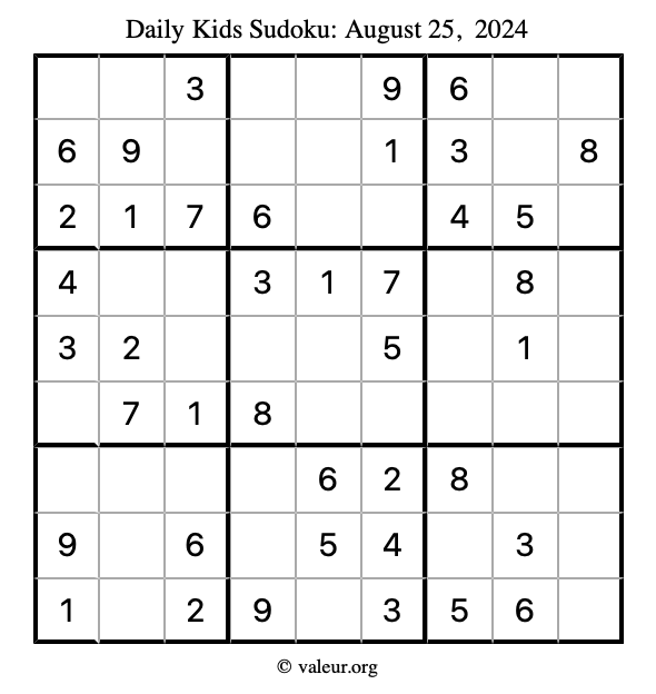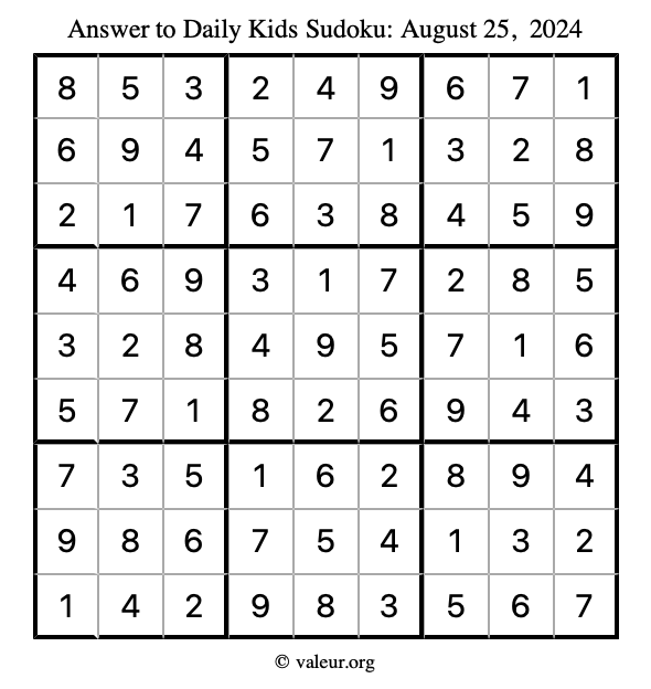 Here is the August 25, 2024 kids sudoku puzzle. You are welcome to print a copy to solve by hand. For your convenience, we have also included the solution further down the page so you can check your work.