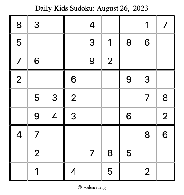 Here is the August 26, 2023 kids sudoku puzzle. You are welcome to print a copy to solve by hand. For your convenience, we have also included the solution further down the page so you can check your work.