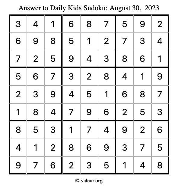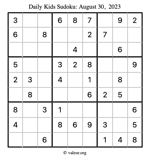Here is the August 30, 2023 kids sudoku puzzle. You are welcome to print a copy to solve by hand. For your convenience, we have also included the solution further down the page so you can check your work.