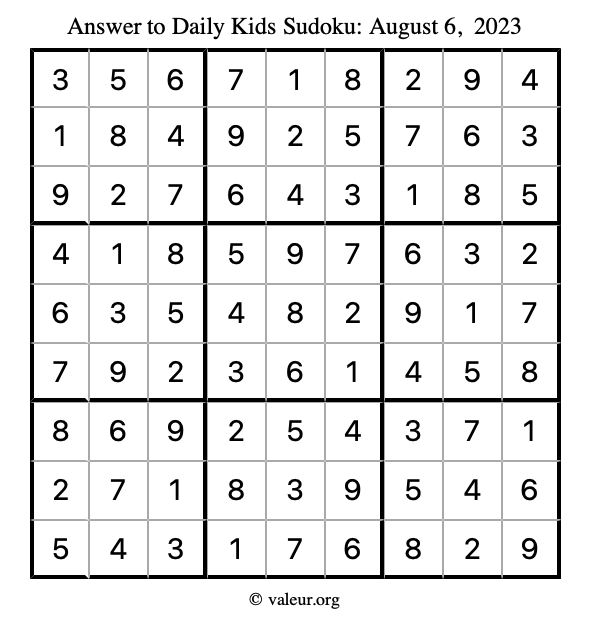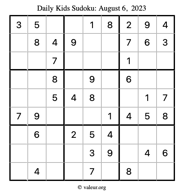 Here is the August 6, 2023 kids sudoku puzzle. You are welcome to print a copy to solve by hand. For your convenience, we have also included the solution further down the page so you can check your work.
