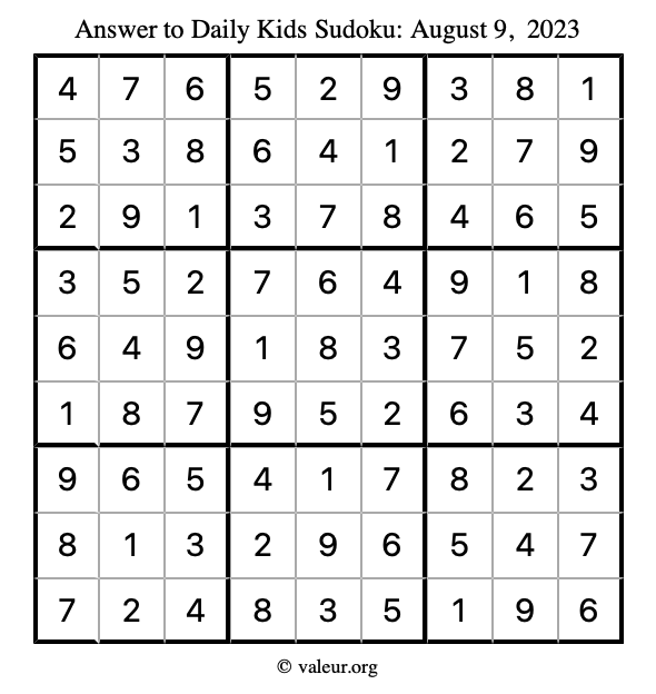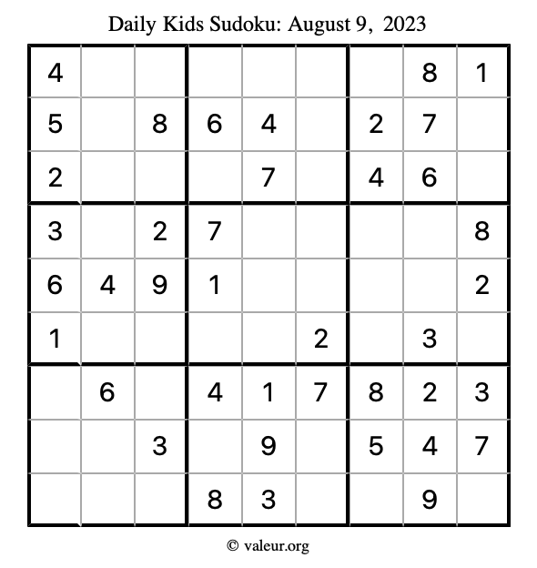 Here is the August 9, 2023 kids sudoku puzzle. You are welcome to print a copy to solve by hand. For your convenience, we have also included the solution further down the page so you can check your work.