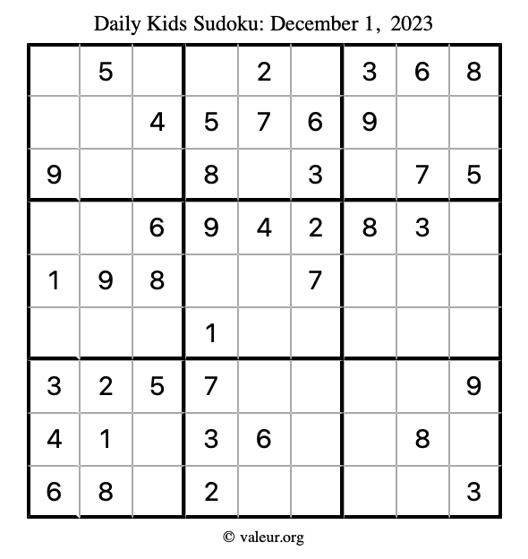 Kids Sudoku December 1, 2023 is not the only sudoku puzzle we have. We create a new kids sudoku puzzle every day for you to print and solve. Check out today's kids sudoku puzzle here!