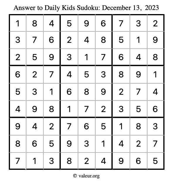 Here is the December 13, 2023 kids sudoku puzzle. You are welcome to print a copy to solve by hand. For your convenience, we have also included the solution further down the page so you can check your work.