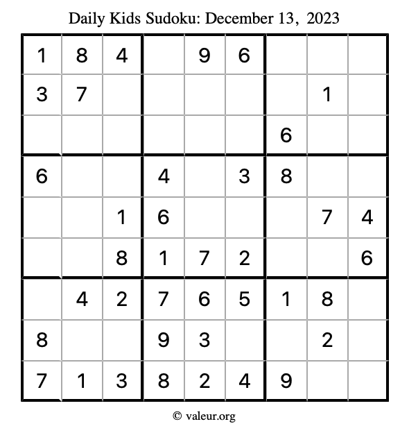 Kids Sudoku December 13, 2023 is not the only sudoku puzzle we have. We create a new kids sudoku puzzle every day for you to print and solve. Check out today's kids sudoku puzzle here!