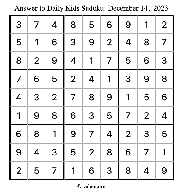 Here is the December 14, 2023 kids sudoku puzzle. You are welcome to print a copy to solve by hand. For your convenience, we have also included the solution further down the page so you can check your work.