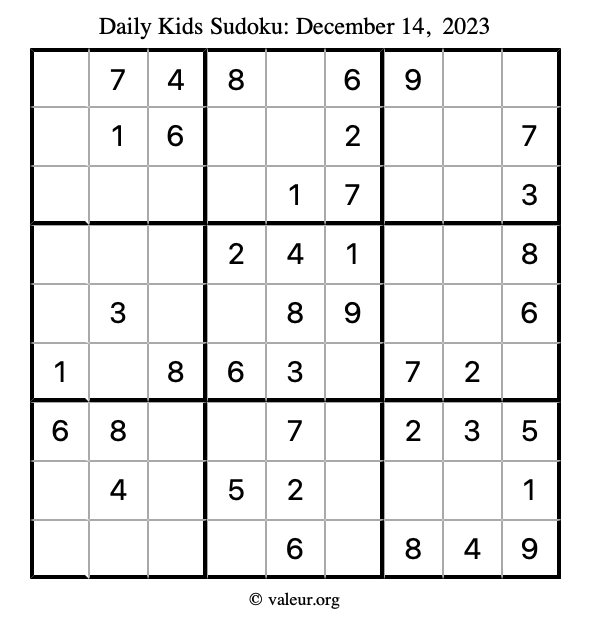 Kids Sudoku December 14, 2023 is not the only sudoku puzzle we have. We create a new kids sudoku puzzle every day for you to print and solve. Check out today's kids sudoku puzzle here!