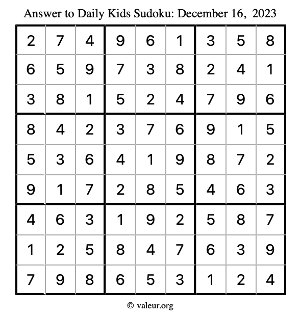 Here is the December 16, 2023 kids sudoku puzzle. You are welcome to print a copy to solve by hand. For your convenience, we have also included the solution further down the page so you can check your work.