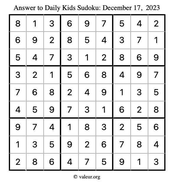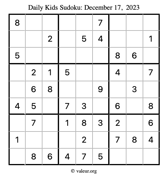 Kids Sudoku December 17, 2023 is not the only sudoku puzzle we have. We create a new kids sudoku puzzle every day for you to print and solve. Check out today's kids sudoku puzzle here!