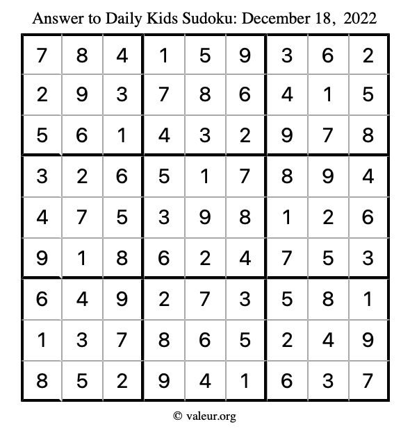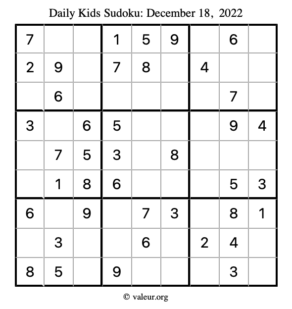 Here is the December 18, 2022 kids sudoku puzzle. You are welcome to print a copy to solve by hand. For your convenience, we have also included the solution further down the page so you can check your work.