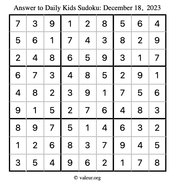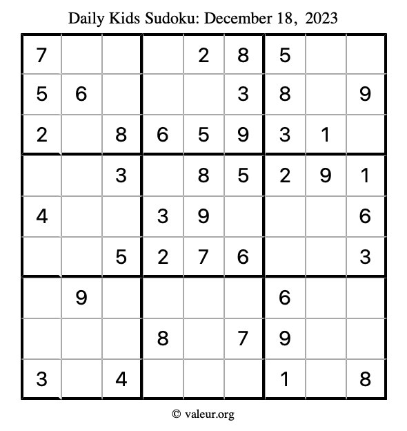 Kids Sudoku December 18, 2023 is not the only sudoku puzzle we have. We create a new kids sudoku puzzle every day for you to print and solve. Check out today's kids sudoku puzzle here!