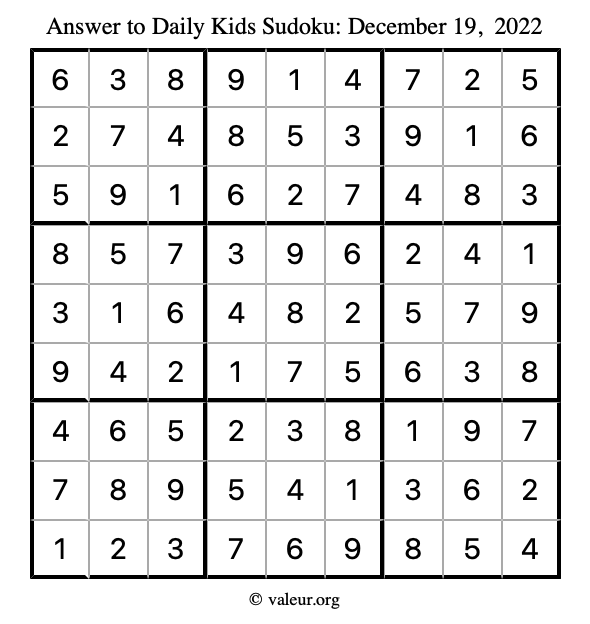 Here is the December 19, 2022 kids sudoku puzzle. You are welcome to print a copy to solve by hand. For your convenience, we have also included the solution further down the page so you can check your work.