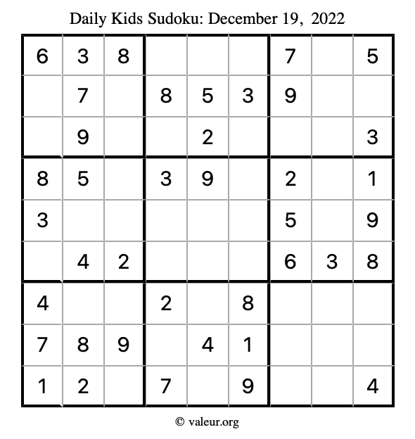 Kids Sudoku December 19, 2022 is not the only sudoku puzzle we have. We create a new kids sudoku puzzle every day for you to print and solve. Check out today's kids sudoku puzzle here!