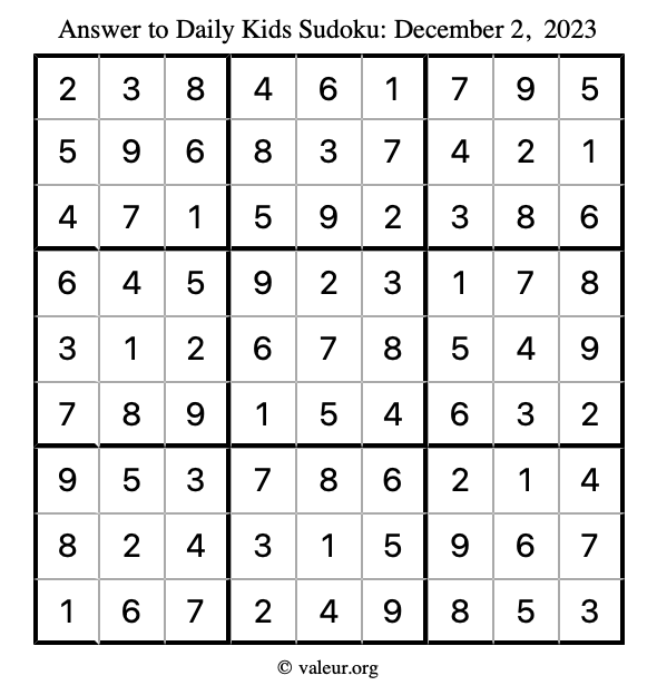 Here is the December 2, 2023 kids sudoku puzzle. You are welcome to print a copy to solve by hand. For your convenience, we have also included the solution further down the page so you can check your work.