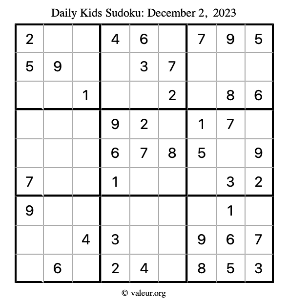 Kids Sudoku December 2, 2023 is not the only sudoku puzzle we have. We create a new kids sudoku puzzle every day for you to print and solve. Check out today's kids sudoku puzzle here!