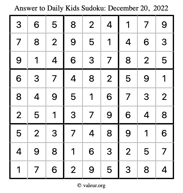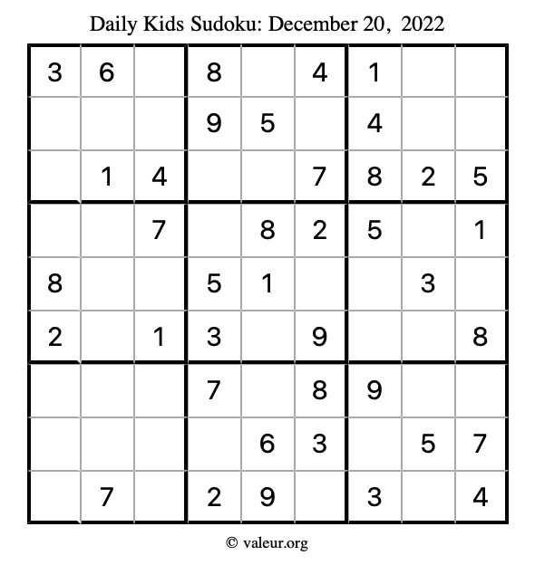Here is the December 20, 2022 kids sudoku puzzle. You are welcome to print a copy to solve by hand. For your convenience, we have also included the solution further down the page so you can check your work.