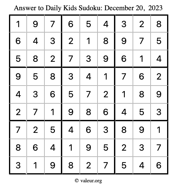 Here is the December 20, 2023 kids sudoku puzzle. You are welcome to print a copy to solve by hand. For your convenience, we have also included the solution further down the page so you can check your work.