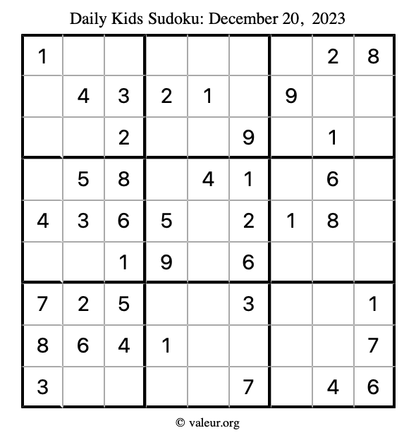Kids Sudoku December 20, 2023 is not the only sudoku puzzle we have. We create a new kids sudoku puzzle every day for you to print and solve. Check out today's kids sudoku puzzle here!