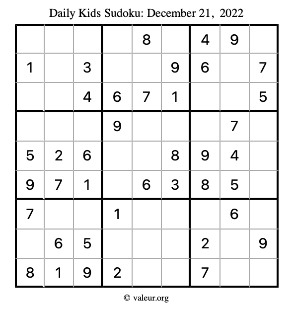 Kids Sudoku December 21, 2022 is not the only sudoku puzzle we have. We create a new kids sudoku puzzle every day for you to print and solve. Check out today's kids sudoku puzzle here!