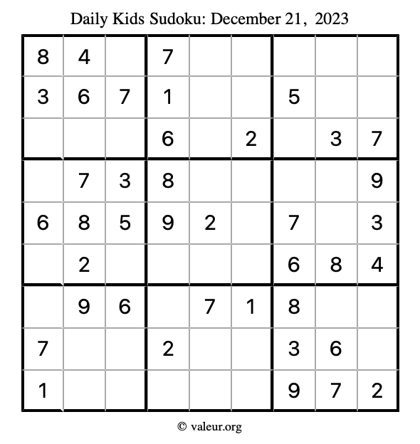 Kids Sudoku December 21, 2023 is not the only sudoku puzzle we have. We create a new kids sudoku puzzle every day for you to print and solve. Check out today's kids sudoku puzzle here!