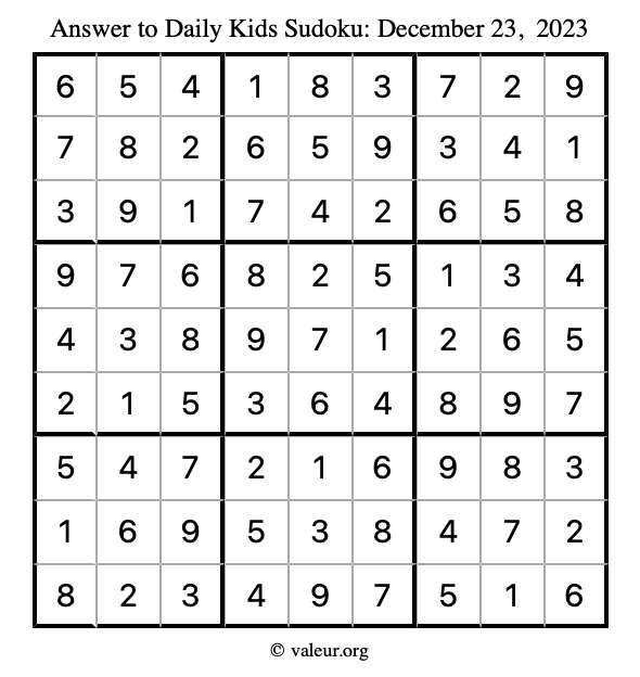 Here is the December 23, 2023 kids sudoku puzzle. You are welcome to print a copy to solve by hand. For your convenience, we have also included the solution further down the page so you can check your work.