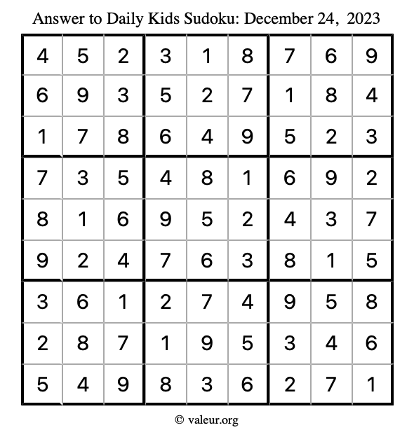 Here is the December 24, 2023 kids sudoku puzzle. You are welcome to print a copy to solve by hand. For your convenience, we have also included the solution further down the page so you can check your work.