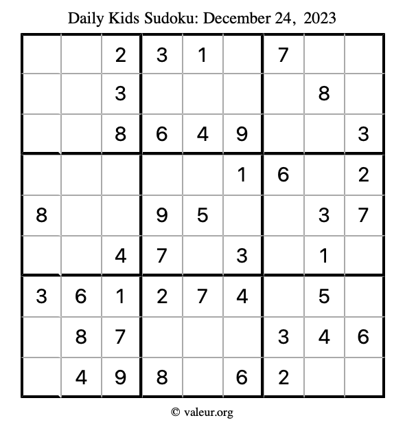 Kids Sudoku December 24, 2023 is not the only sudoku puzzle we have. We create a new kids sudoku puzzle every day for you to print and solve. Check out today's kids sudoku puzzle here!