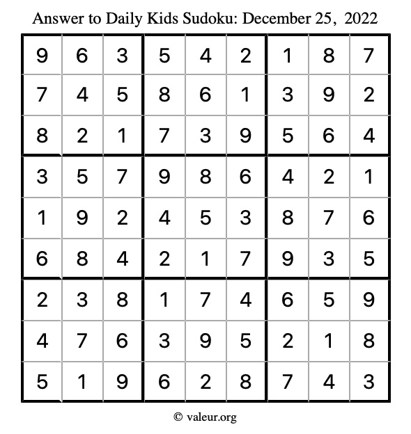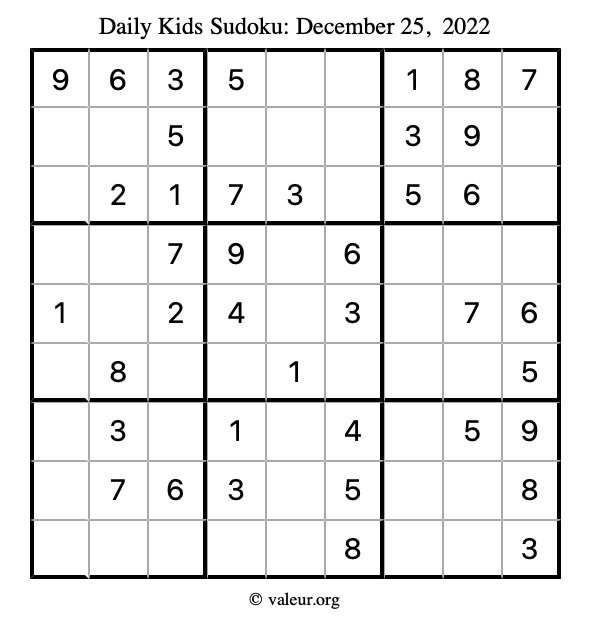Kids Sudoku December 25, 2022 is not the only sudoku puzzle we have. We create a new kids sudoku puzzle every day for you to print and solve. Check out today's kids sudoku puzzle here!