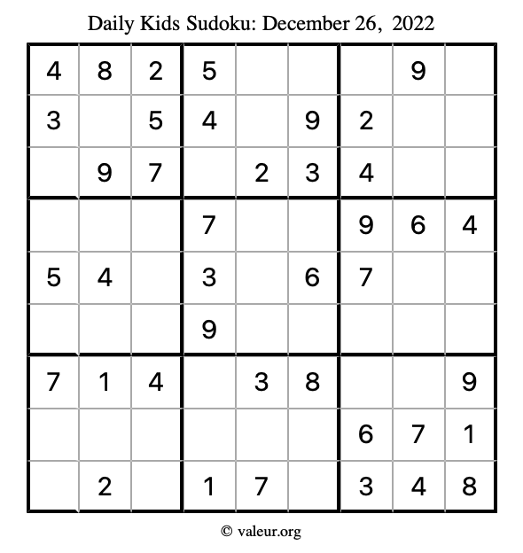 Kids Sudoku December 26, 2022 is not the only sudoku puzzle we have. We create a new kids sudoku puzzle every day for you to print and solve. Check out today's kids sudoku puzzle here!