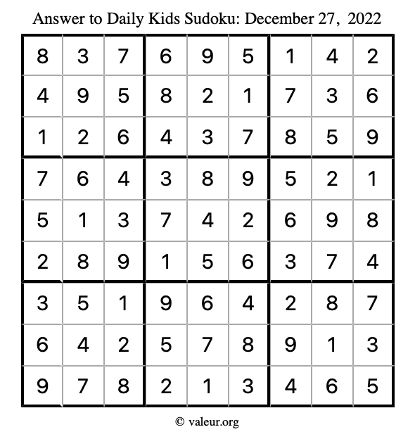 Here is the December 27, 2022 kids sudoku puzzle. You are welcome to print a copy to solve by hand. For your convenience, we have also included the solution further down the page so you can check your work.