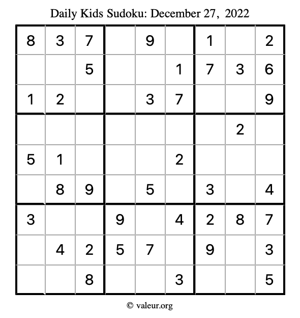 Kids Sudoku December 27, 2022 is not the only sudoku puzzle we have. We create a new kids sudoku puzzle every day for you to print and solve. Check out today's kids sudoku puzzle here!