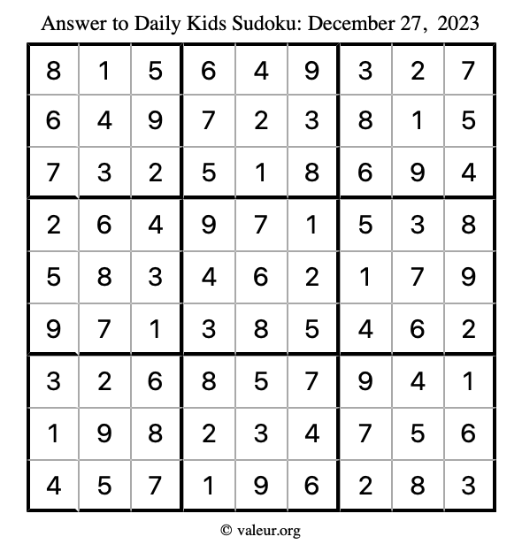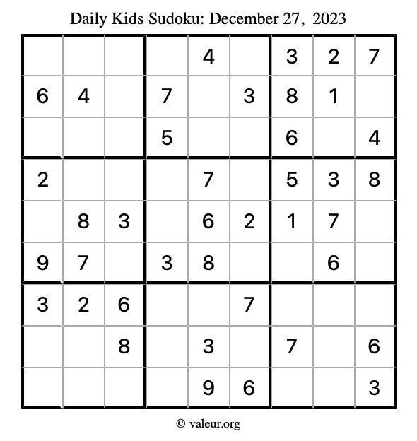 Here is the December 27, 2023 kids sudoku puzzle. You are welcome to print a copy to solve by hand. For your convenience, we have also included the solution further down the page so you can check your work.