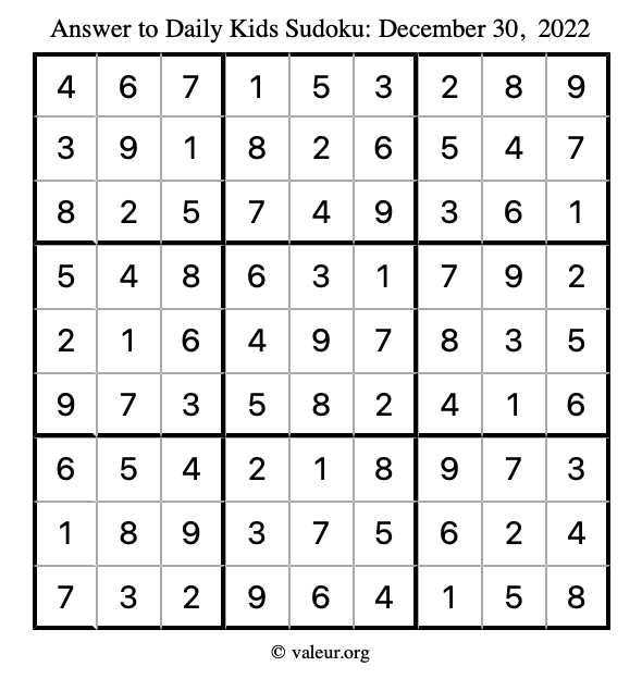 Here is the December 30, 2022 kids sudoku puzzle. You are welcome to print a copy to solve by hand. For your convenience, we have also included the solution further down the page so you can check your work.