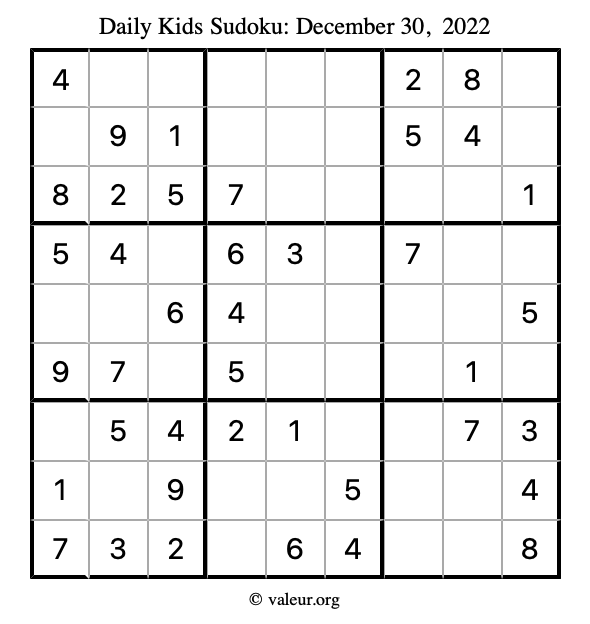 Kids Sudoku December 30, 2022 is not the only sudoku puzzle we have. We create a new kids sudoku puzzle every day for you to print and solve. Check out today's kids sudoku puzzle here!