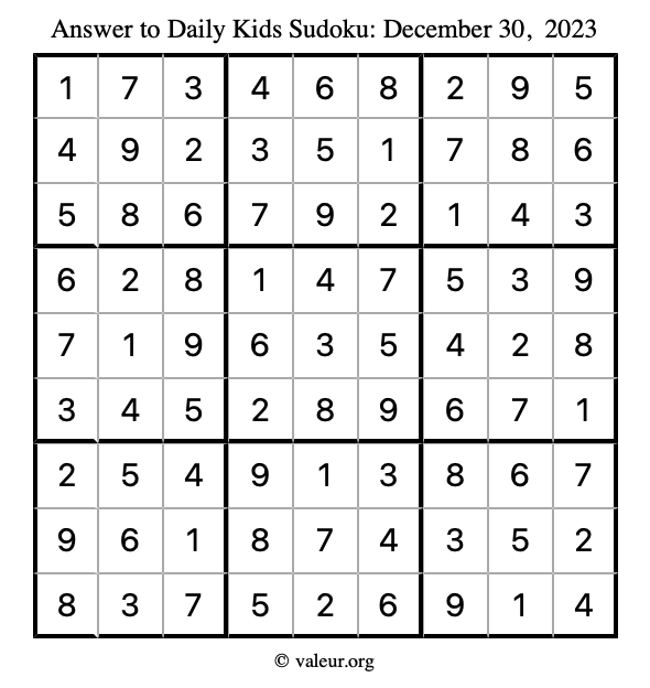 Here is the December 30, 2023 kids sudoku puzzle. You are welcome to print a copy to solve by hand. For your convenience, we have also included the solution further down the page so you can check your work.
