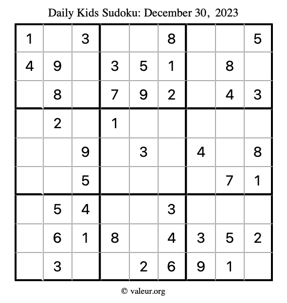 Kids Sudoku December 30, 2023 is not the only sudoku puzzle we have. We create a new kids sudoku puzzle every day for you to print and solve. Check out today's kids sudoku puzzle here!