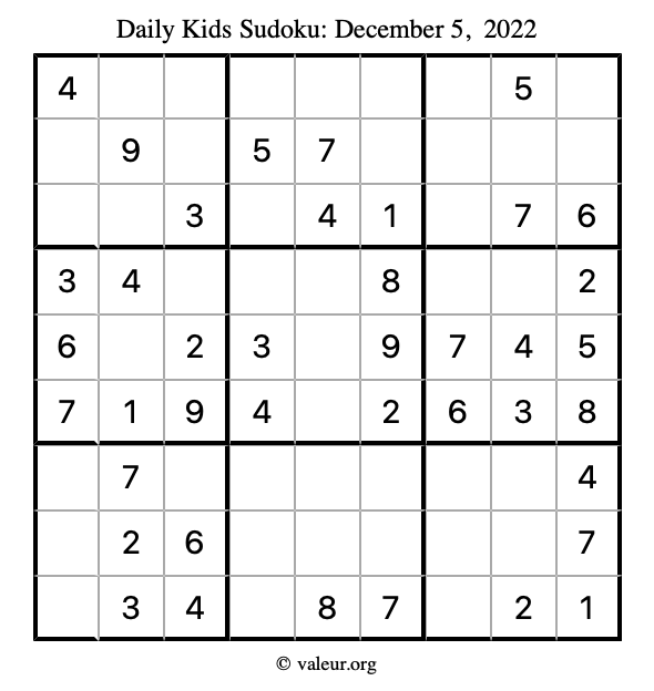 Here is the December 5, 2022 kids sudoku puzzle. You are welcome to print a copy to solve by hand. For your convenience, we have also included the solution further down the page so you can check your work.