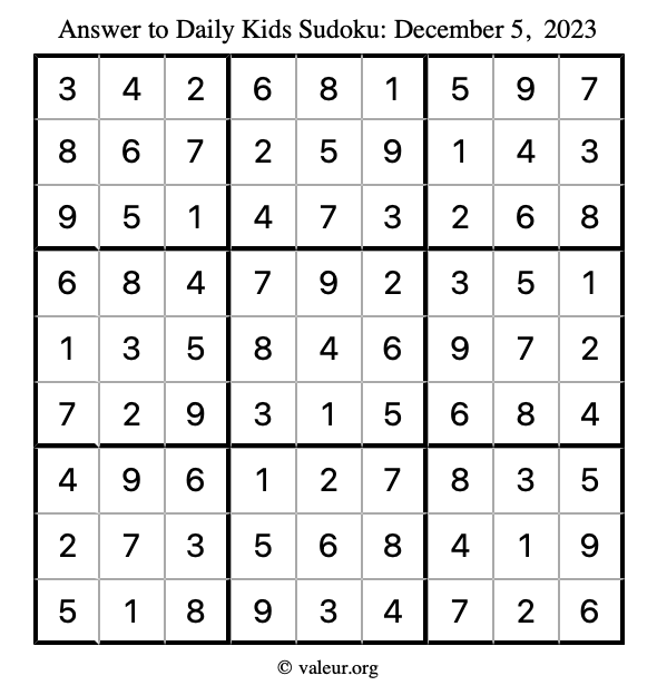 Here is the December 5, 2023 kids sudoku puzzle. You are welcome to print a copy to solve by hand. For your convenience, we have also included the solution further down the page so you can check your work.