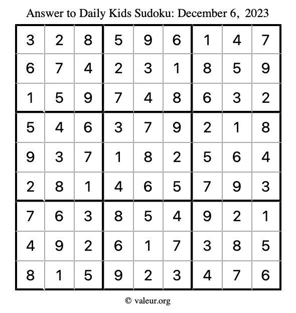 Here is the December 6, 2023 kids sudoku puzzle. You are welcome to print a copy to solve by hand. For your convenience, we have also included the solution further down the page so you can check your work.