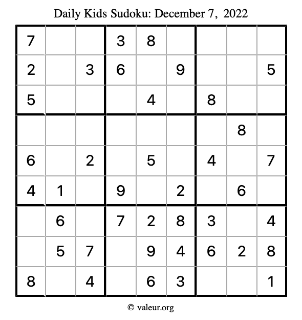 Here is the December 7, 2022 kids sudoku puzzle. You are welcome to print a copy to solve by hand. For your convenience, we have also included the solution further down the page so you can check your work.