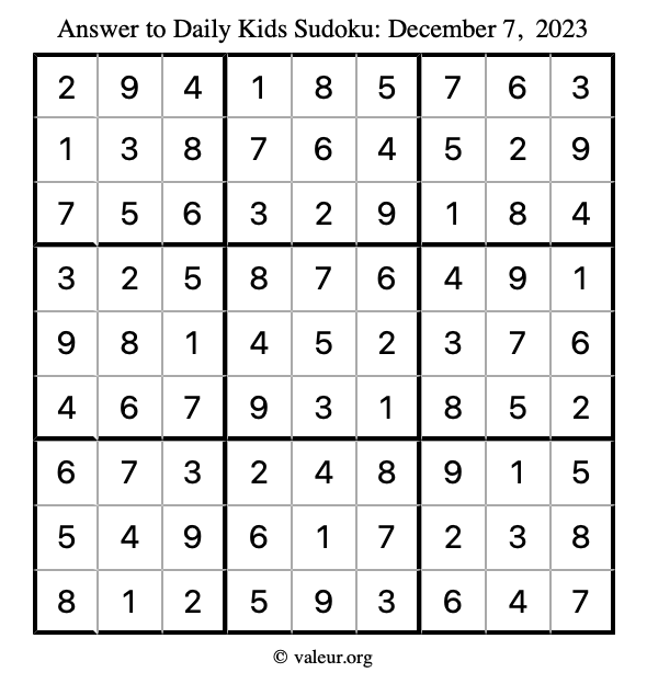 Here is the December 7, 2023 kids sudoku puzzle. You are welcome to print a copy to solve by hand. For your convenience, we have also included the solution further down the page so you can check your work.