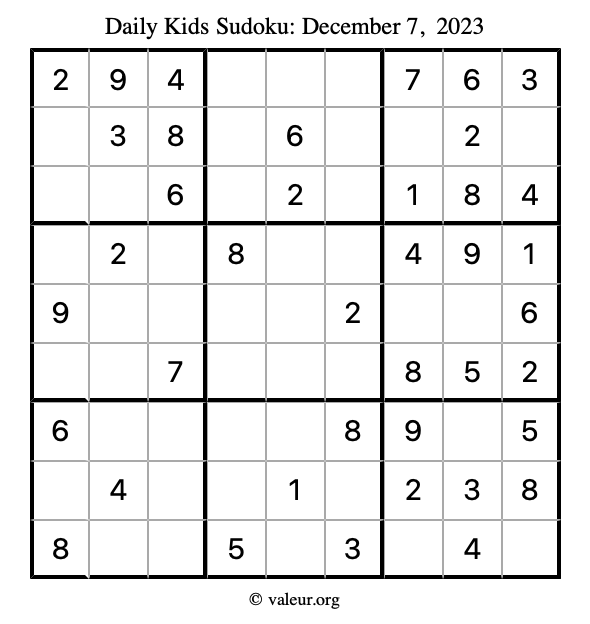 Kids Sudoku December 7, 2023 is not the only sudoku puzzle we have. We create a new kids sudoku puzzle every day for you to print and solve. Check out today's kids sudoku puzzle here!