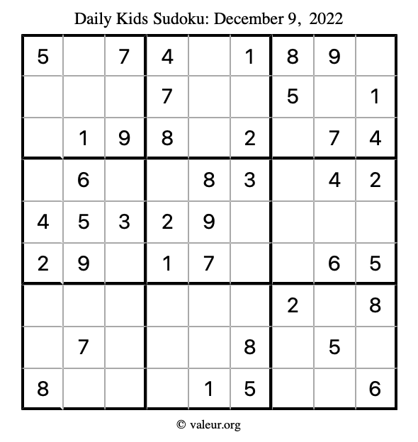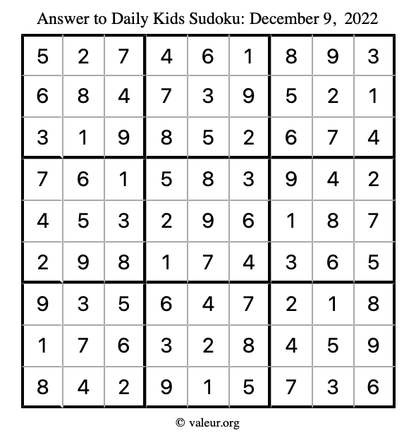 Here is the December 9, 2022 kids sudoku puzzle. You are welcome to print a copy to solve by hand. For your convenience, we have also included the solution further down the page so you can check your work.