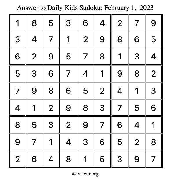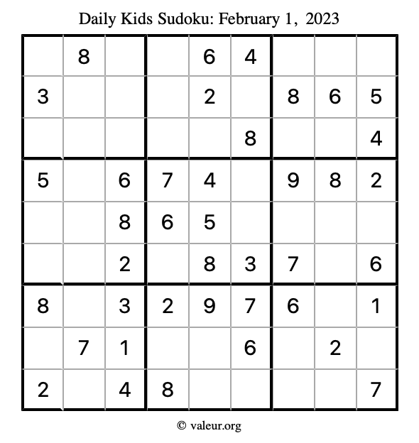 Kids Sudoku February 1, 2023 is not the only sudoku puzzle we have. We create a new kids sudoku puzzle every day for you to print and solve. Check out today's kids sudoku puzzle here!