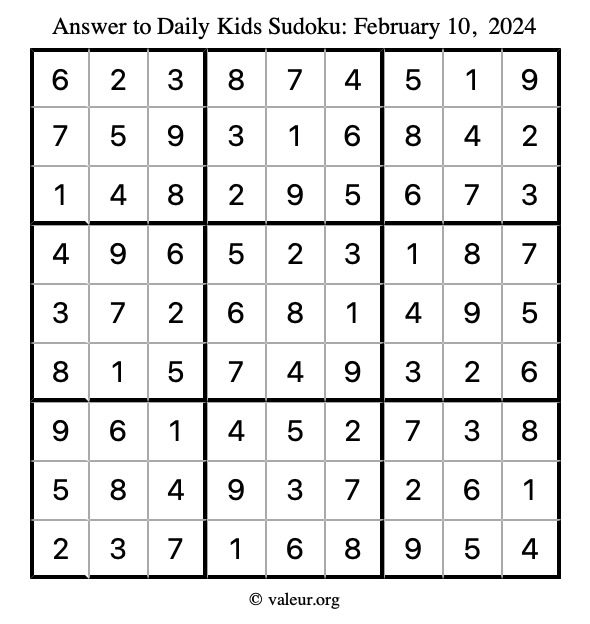Here is the February 10, 2024 kids sudoku puzzle. You are welcome to print a copy to solve by hand. For your convenience, we have also included the solution further down the page so you can check your work.