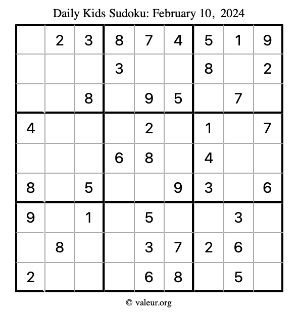 Kids Sudoku February 10, 2024 is not the only sudoku puzzle we have. We create a new kids sudoku puzzle every day for you to print and solve. Check out today's kids sudoku puzzle here!