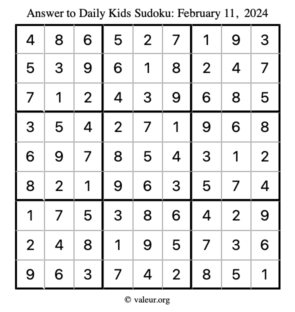 Here is the February 11, 2024 kids sudoku puzzle. You are welcome to print a copy to solve by hand. For your convenience, we have also included the solution further down the page so you can check your work.