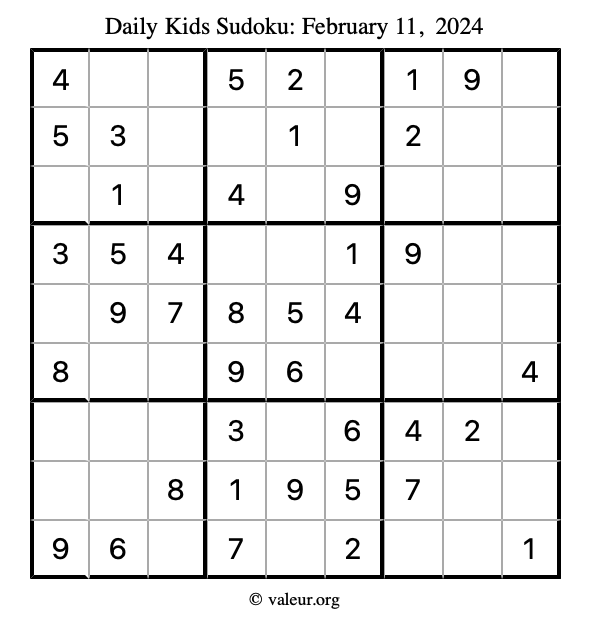 Kids Sudoku February 11, 2024 is not the only sudoku puzzle we have. We create a new kids sudoku puzzle every day for you to print and solve. Check out today's kids sudoku puzzle here!