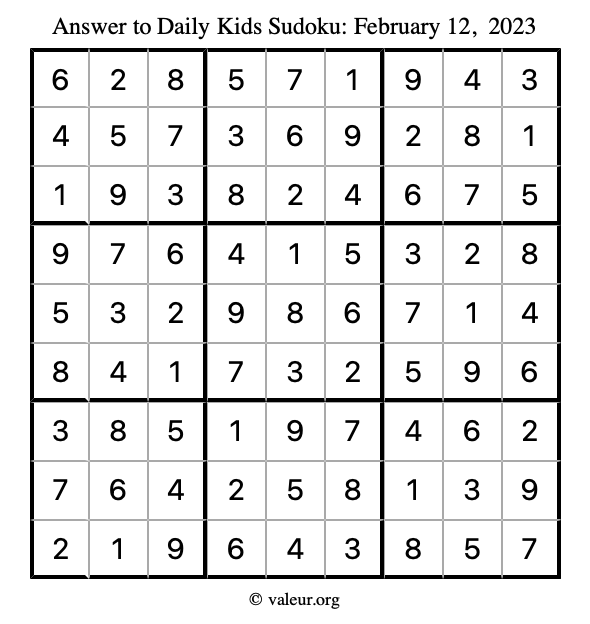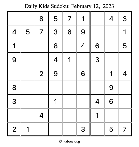 Kids Sudoku February 12, 2023 is not the only sudoku puzzle we have. We create a new kids sudoku puzzle every day for you to print and solve. Check out today's kids sudoku puzzle here!